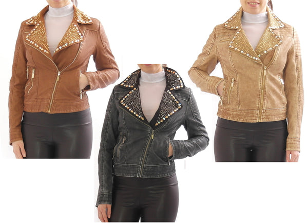Damen Biker-Jacke mit Nieten Steinenin verschiedenen Farben mit seitlichen Reißverschluss-TaschenVorne ReißverschlussAm Kragen mit Nieten-Steinen verarbeitet.
