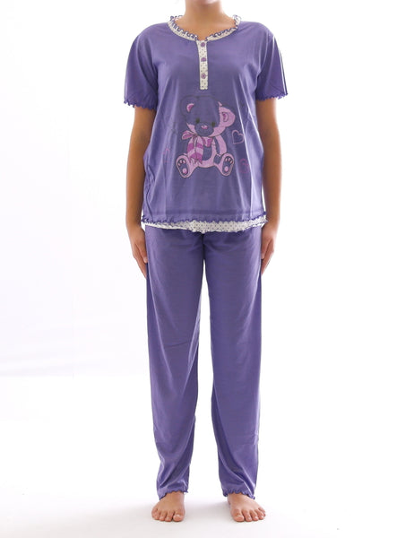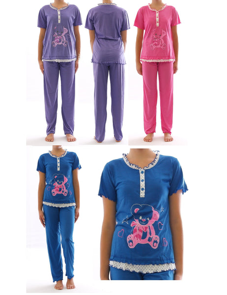 •Modell: Damen Schlafanzug•Größen: S, M, L, XL, XXL•Farben: Violett, Rosa, Blau•Material: 92% Baumwolle, 8% Polyester