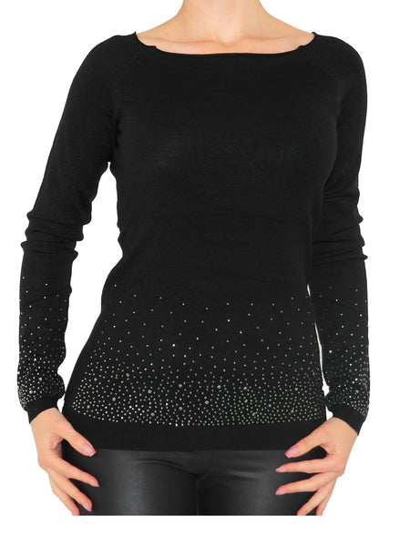 Mit Glitzernieten unten und an den Ärmel.